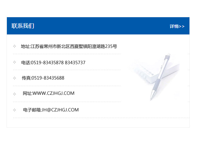 地址:常州市新北區友邦商務大廈1幢16、17層  電話:0519-85101652  傳真:0519-85112595  郵編:213022  網址:www.cz-jiayue_cn.ahdnwx.com  郵箱:xiajifengaa@163.com